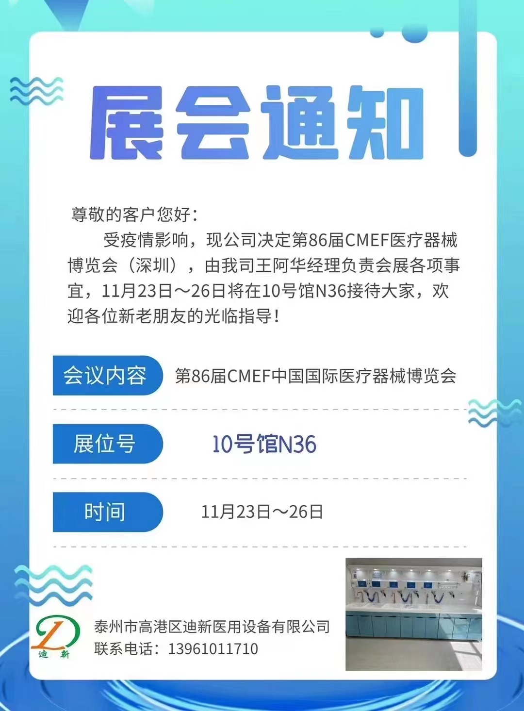 尊敬的客戶您好: 受疫情影響,現(xiàn)公司決定第86屆CMEF醫(yī)療器械博覽會(huì)(深圳),由我司王阿華經(jīng)理負(fù)責(zé)會(huì)展各項(xiàng)事宜,11月23日~26日將在10號(hào)館N36接待大家,歡迎各位新老朋友的光臨指導(dǎo)!......